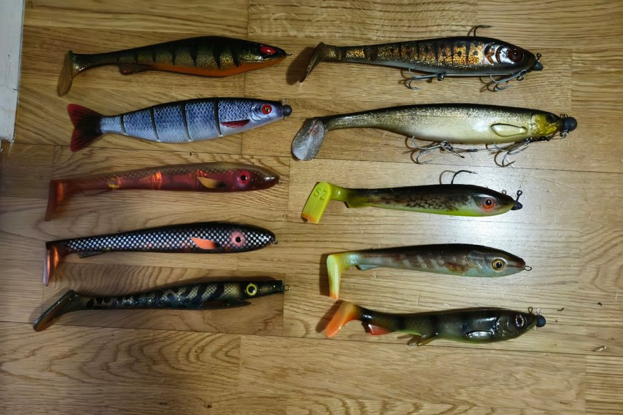 Samling av 10 olika fiskebeten i varierande färger och mönster. Passar för olika typer av fiske.