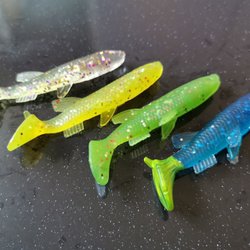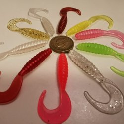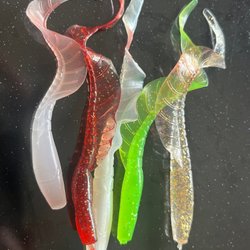 Detta fiskedrag har en röd och vit färgkombination och är utrustat med tre krokar. Det är designat för att attrahera fisk och kan användas i olika vattenförhållanden. Längden på draget kan uppskattas med hjälp av linjalen i bilden.