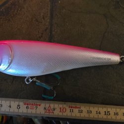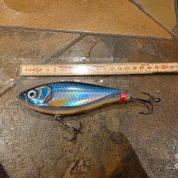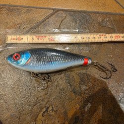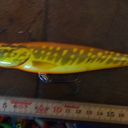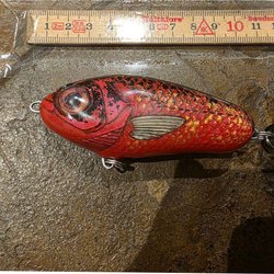 Fiskedrag med en kombination av orange och svart färg. Utrustad med ögon och krokar för fiske. Mått: cirka 13 cm.