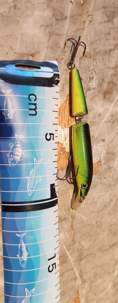 Detta fiskedrag har en grön och svart design med en krok. Passar för fiske i olika vattenmiljöer.