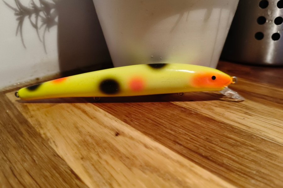 Ett fiskedrag med en färgglad design i gult med svarta och orange prickar. Lämplig för olika typer av fiske.
