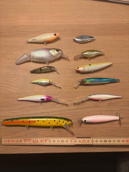Samling av 14 olika fiskebeten i varierande storlekar och färger. Passar för olika typer av fiske. Se bilder för detaljer.
