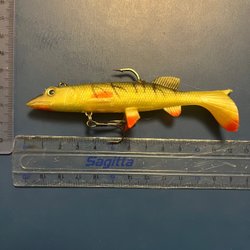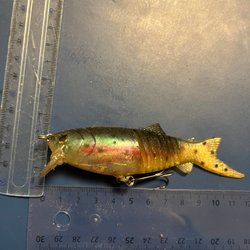Rapala jointed 13cm ca 16g flytande. Ser ut som den har ett lagat krokhål vid delning Det är en Rapala Finland. Krokar och fjädringar är inte orginal. Perfekt för både fiskaren och samlaren.