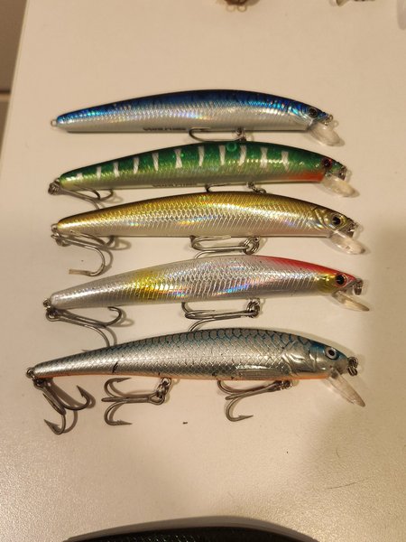 Fem fiskedrag i olika färger och mönster. Passar för fiske i både söt- och saltvatten. Varje drag har en krok och är designat för att attrahera fisk.