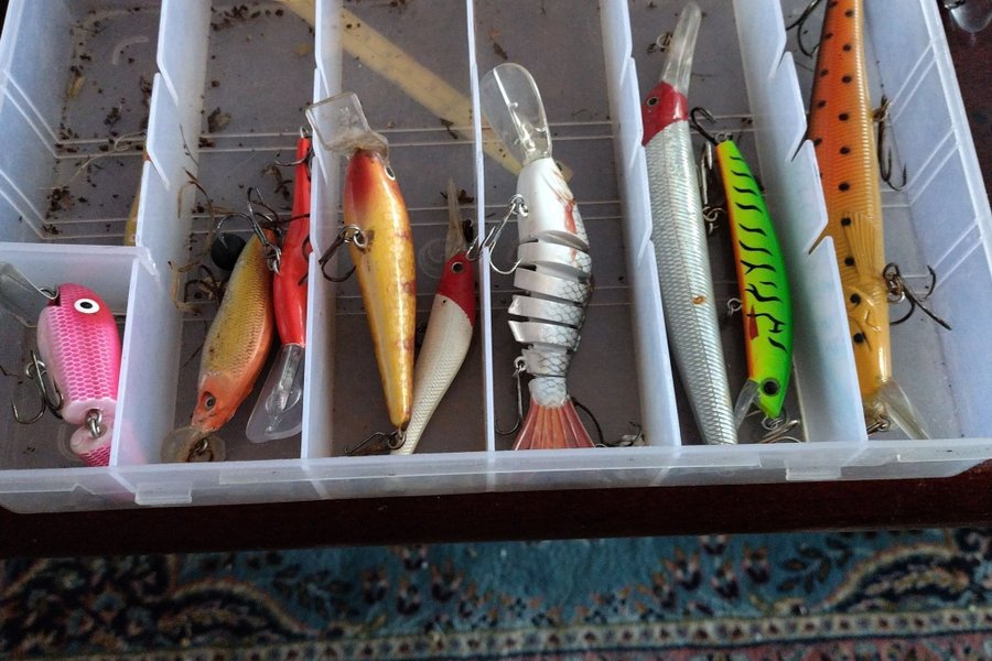 En samling av olika fiskebeten i en plastlåda. Innehåller flera typer av beten med olika färger och former. Lämplig för fiskeentusiaster som söker att komplettera sin utrustning.