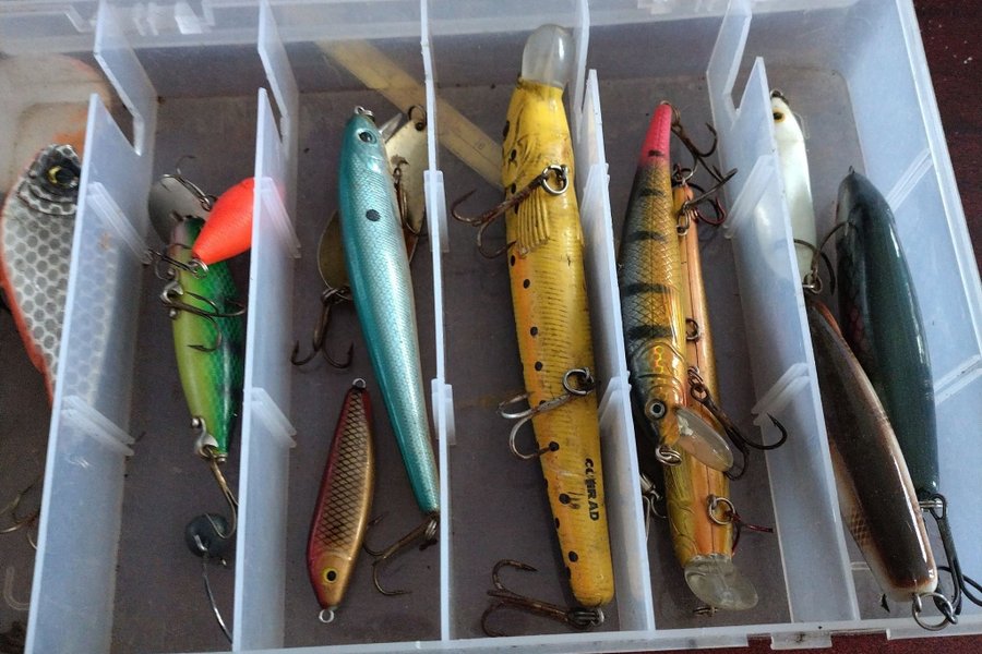 En samling av olika fiskebeten i en plastlåda. Betena inkluderar flera typer och färger, vilket kan vara användbart för olika fiskeformer. Lådan har avdelningar för att organisera betena.