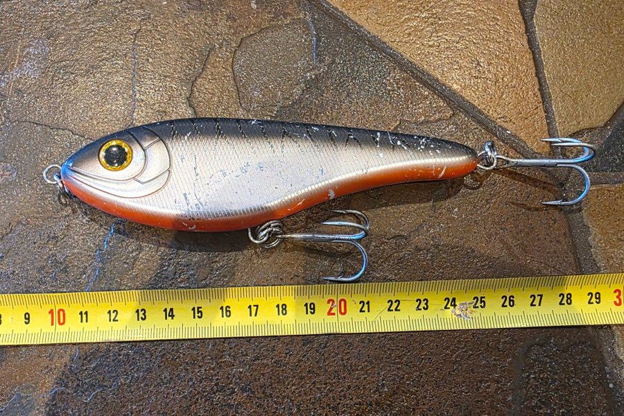 Gäddbete. Utrustad med krokar och ögla för enkel användning. Längd: cirka 20 cm.