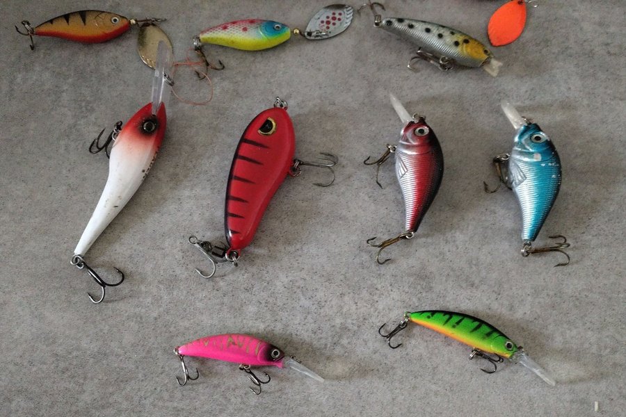 Samling av 13 olika fiskebeten i varierande färger och former. Passar för olika typer av fiske. Se bilder för detaljer.