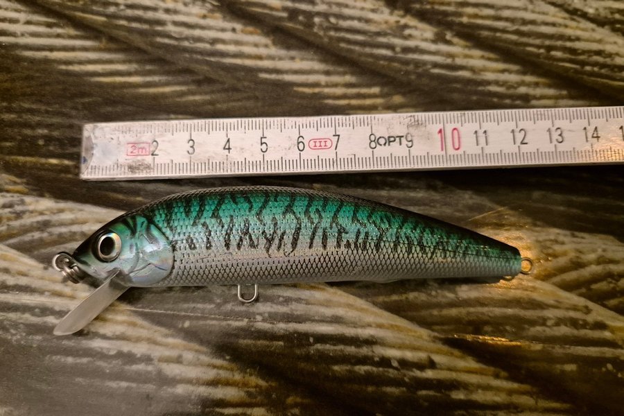 Ett fiskedrag med en längd på cirka 10 cm. Färgen är en kombination av silver och grönt, vilket kan vara attraktivt för olika fiskarter. Draget har en realistisk design och är utrustat med en krok för enkel användning.