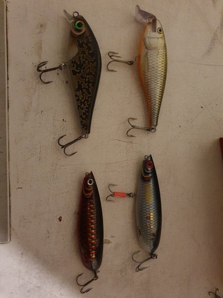 Set med fyra rapala 2 x- rap på 70 gr 2 st scoop men vet ej vikt men kastas lätt med spinnspö iaf ...är i olika färger och mönster. användbar för olika typer av fiske tex för öring gös gädda mm dom är i bra skick