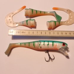 Två fiskedrag enl AI kända märken. Dessa är dock omärkta. Ca 5cm utan sked. Flytande men djupgående. Rasselkulor.