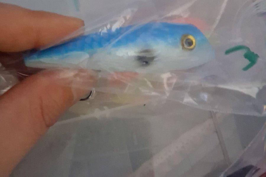 Plastfiskedrag i blå färg, lämplig för fiske. Kan användas för olika typer av fiskeaktiviteter.