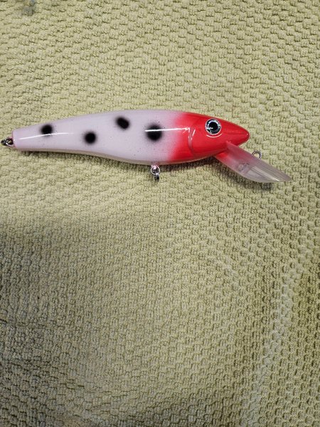 Wobbler 16 cm ca 35 gr. Egenmålad airbrusch. Krok 2/0. Fin gång lovas. Flytande, går ner 4-6 m vid trolling. Fin att kasta också. Samfraktar gärna