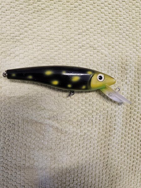 Wobbler 16 cm ca 35 gr. Egenmålad airbrusch. Krok 2/0. Fin gång lovas. Flytande, går ner 4-6 m vid trolling. Fin att kasta också. Samfraktar gärna