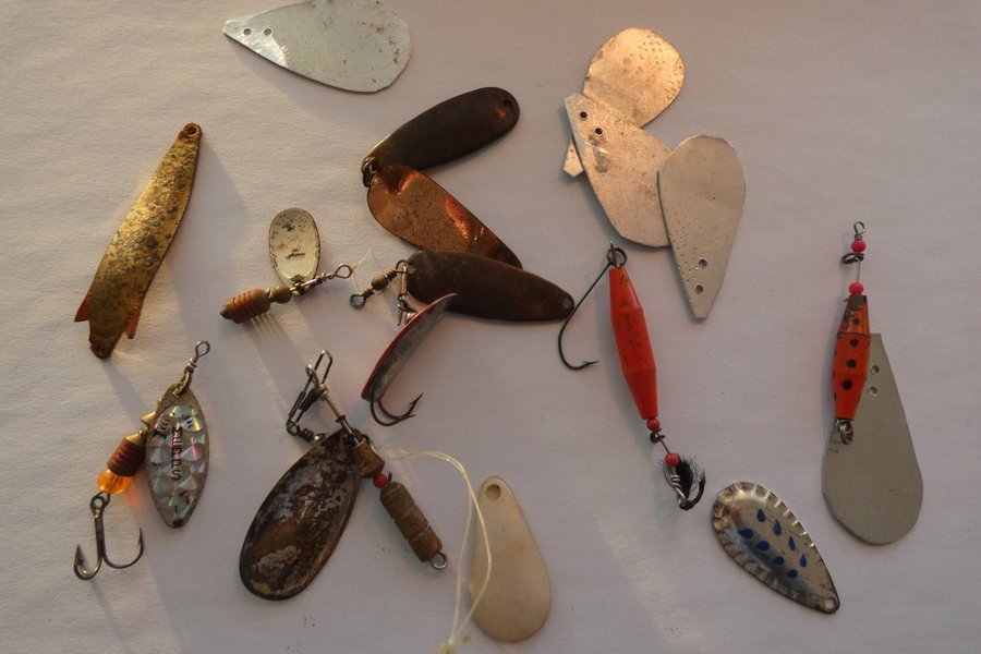 Blandade fiskebeten i olika storlekar och material. Inkluderar både metall- och plastdrag. Passar för olika typer av fiske.