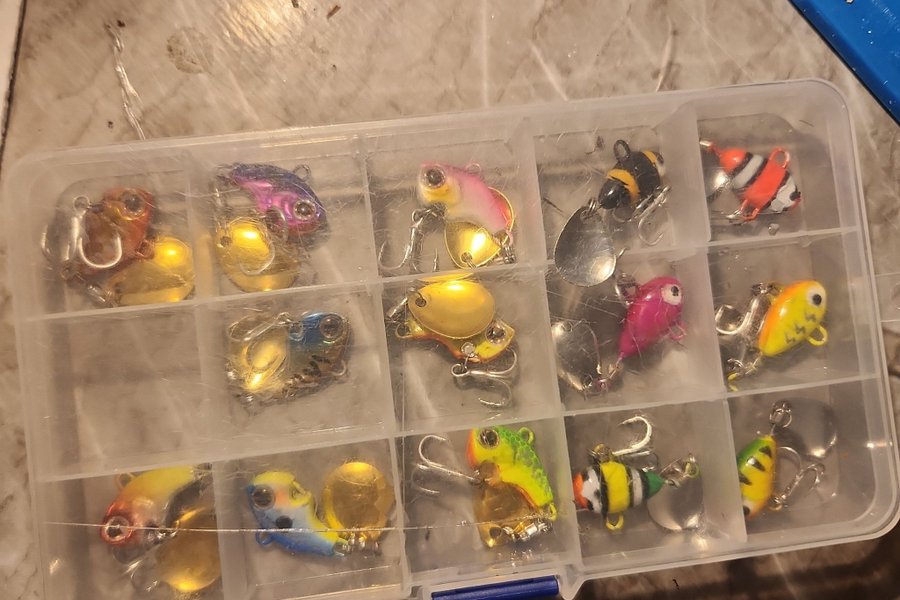 Set med olika fiskedrag i en plastlåda. Innehåller flera färger och former, lämpliga för fiske. Lådan har flera fack för enkel förvaring.