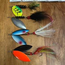 En spinnare med en kombination av metall och fjädrar. Utrustad med en krok och en färgglad design. Passar för fiske i sjöar och vattendrag.