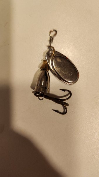 En spinnare med en krok och en metallkropp. Passar för fiske och kan användas i olika vattenmiljöer.