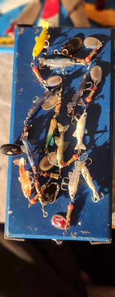 En samling av olika fiskebeten i varierande färger och former. Inkluderar både plast- och metallkomponenter. Passar för fiskeentusiaster som söker att utöka sin utrustning.