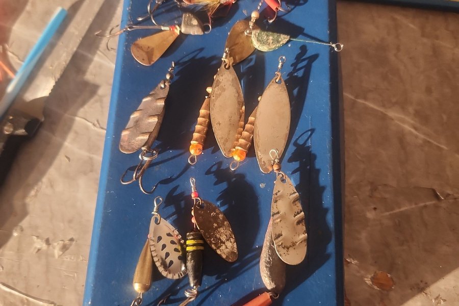 Ett urval av fiskespön och beten i olika storlekar och former. Passar för olika typer av fiske. Se bilder för detaljer.