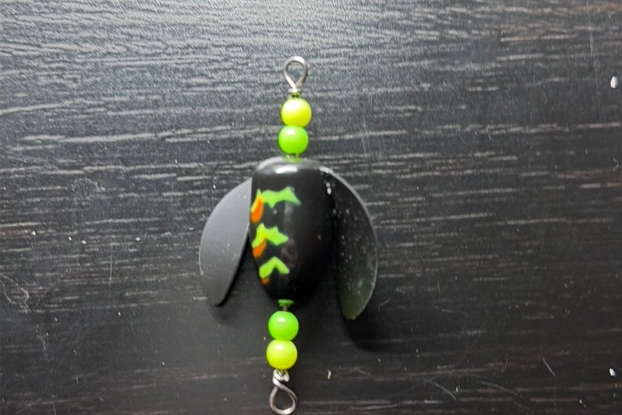Handgjord spin n glo rig, tillverkad med 1mm rostfri tråd. Kropp ca 30x15mm Total längd ca 65mm.