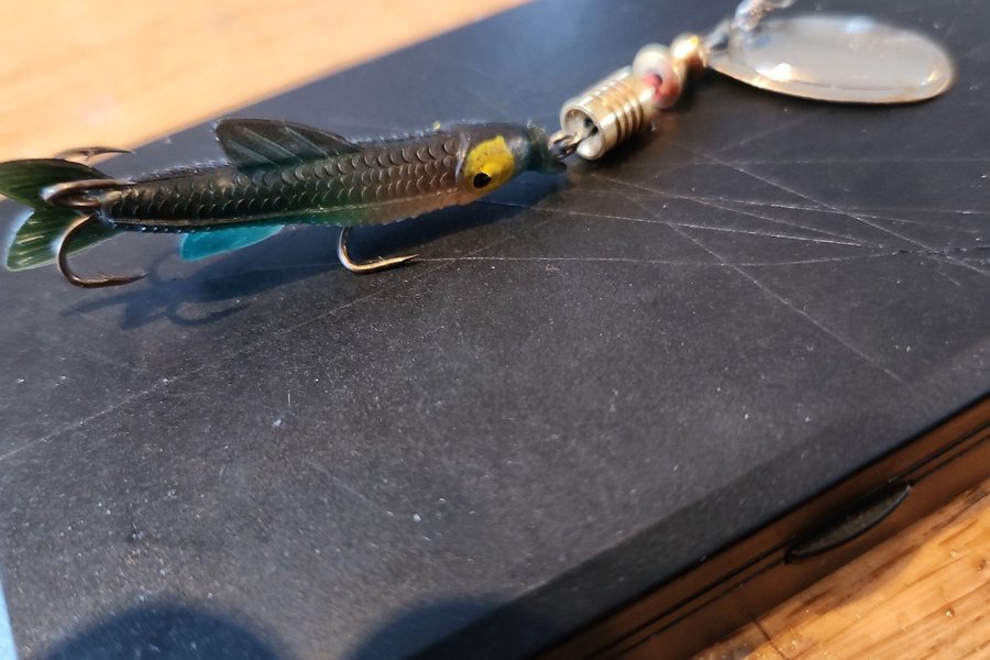 Detta fiskedrag är designat för att efterlikna en fisk. Utrustat med krokar och en snurra för att öka attraktionen. Passar för olika typer av fiske.