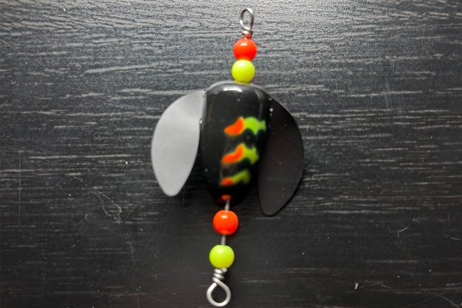 Handgjord spin n glo rig, tillverkad med 1mm rostfri tråd. Kropp ca 30x15mm Total längd ca 65mm.