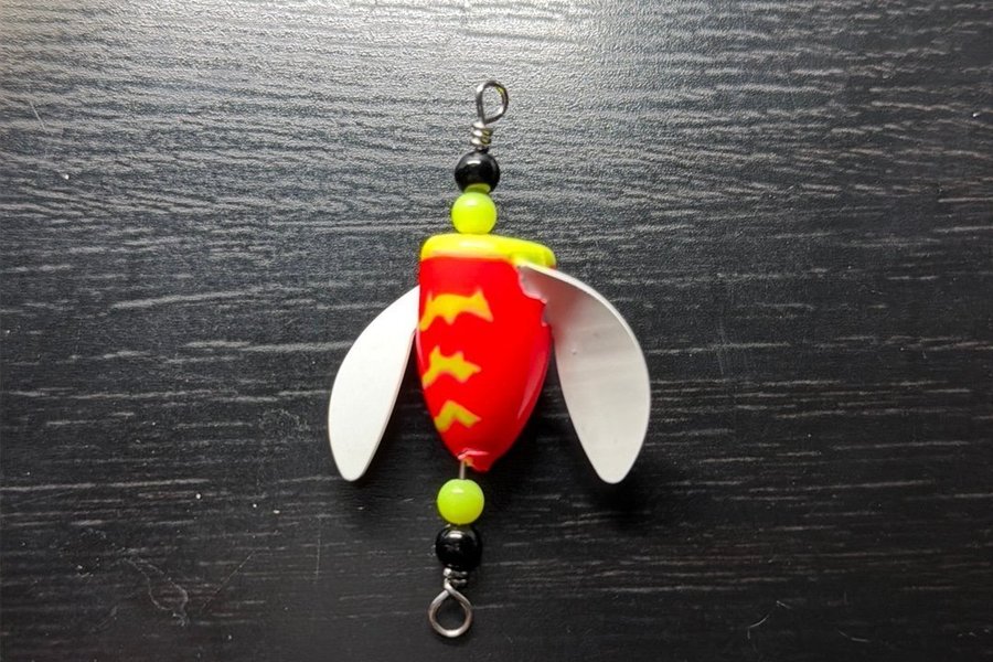 Handgjord spin n glo rig, tillverkad med 1mm rostfri tråd. Kropp ca 30x15mm Total längd ca 65mm.
