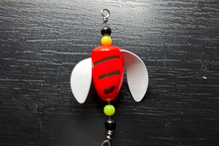 Handgjord spin n glo rig, tillverkad med 1mm rostfri tråd. Kropp ca 30x15mm Total längd ca 65mm.