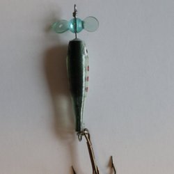 Set med flera fiskedrag i metall (skedar/spinnare) i koppar och silverfärg, med röda pärlor och monterade trekrokar/singelkrokar samt fjäder-/pälsdetaljer på vissa. Olika storlekar och färger enligt bilderna.