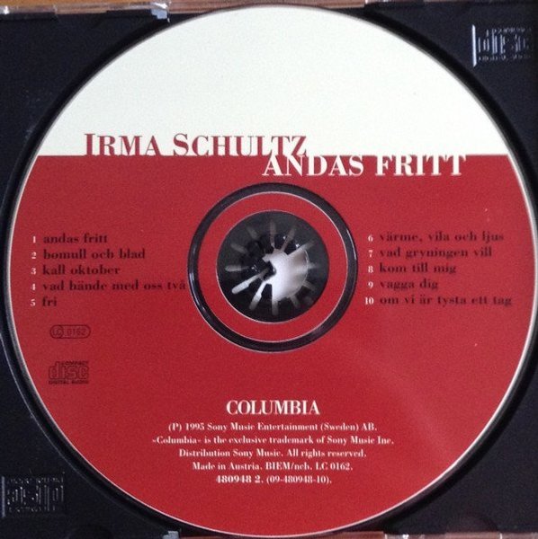 CD-skiva med Irma Schultz album Andas Fritt från 1995. Innehåller låtarna: Andas Fritt, Bomull Och Blad, Kall Oktober, Vad Hände Med Oss Två, Fri, Värme, Vila Och Ljus, Vad Gryningen Vill, Kom Till Mig, Vagga Dig, Om Vi Är Tysta Ett Tag.