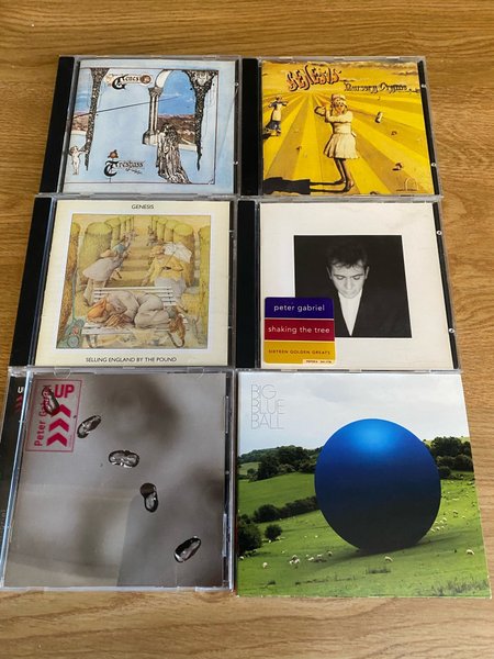 Samling av CD-skivor med Genesis och Peter Gabriel. Inkluderar albumen: Trespass, Nursery Cryme, Selling England by the Pound, Shaking the Tree, Up och Big Blue Ball.