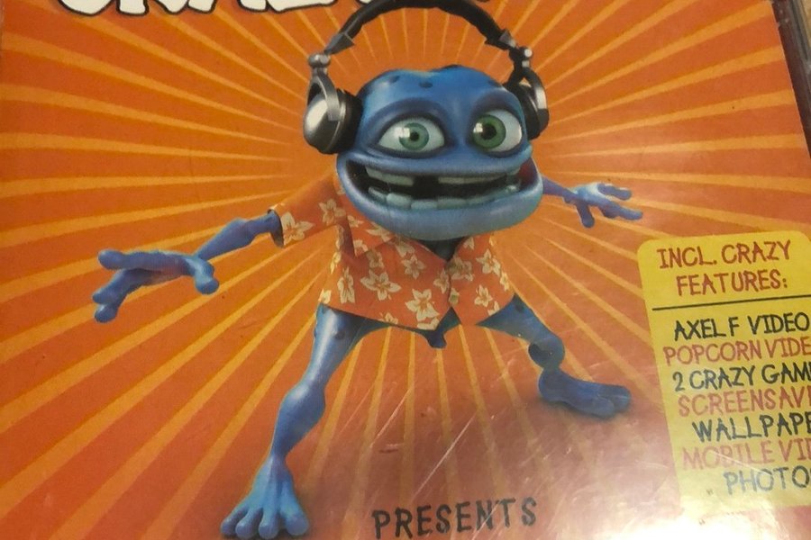 CD med Crazy Frog Presents Crazy Hits. Innehåller Axel F video, Popcorn video, 2 Crazy Games, skärmsläckare, bakgrundsbilder, mobilvideo och foton.