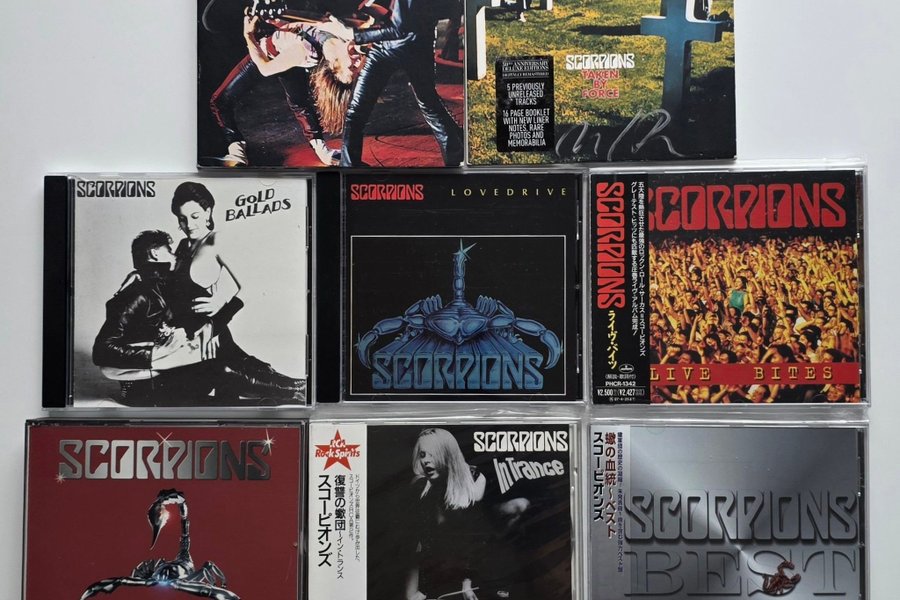 CD samling af Scorpions, inklusive Tokyo Tapes, Taken by Force, Gold Ballads, Lovedrive, Live Bites, Platinum Collection, In Trance og Best.