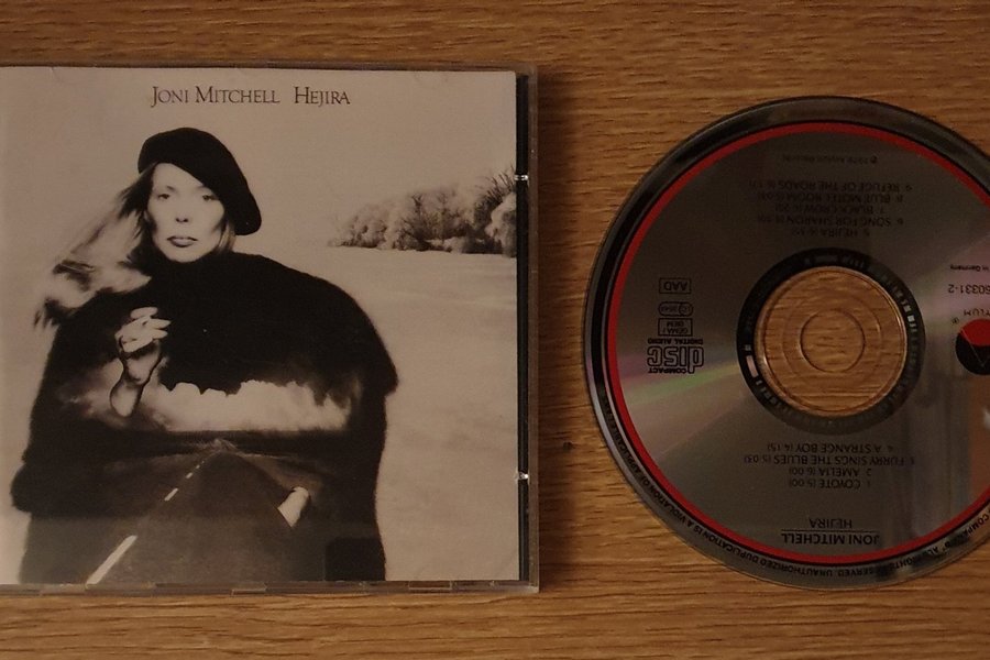CD-album med Joni Mitchell och titeln Hejira. Skivan innehåller låtarna Coyote, Amelia, Furry Sings The Blues, A Strange Boy, Hejira, Song For Sharon, Black Crow, Blue Motel Room och Refuge Of The Roads. Tillverkad i Tyskland.