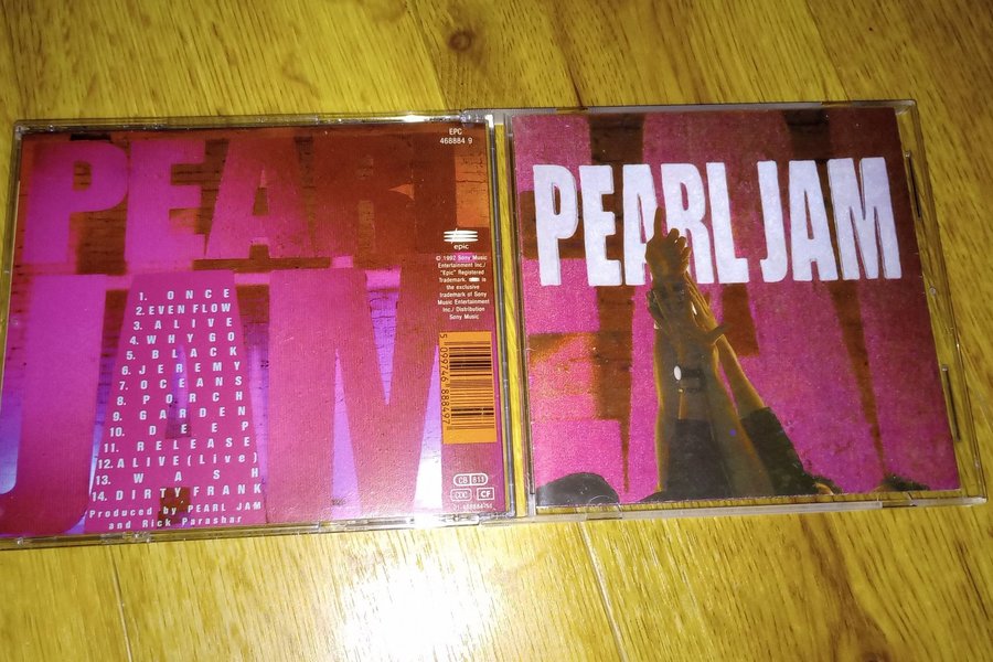 CD-album med Pearl Jam – Ten. Innehåller låtarna Once, Even Flow, Alive, Why Go, Black, Jeremy, Oceans, Porch, Garden, Deep, Release, Alive (Live), Wash och Dirty Frank. Producerad av Pearl Jam och Rick Parashar. Utgiven av Sony Music Entertainment Inc. / Epic.