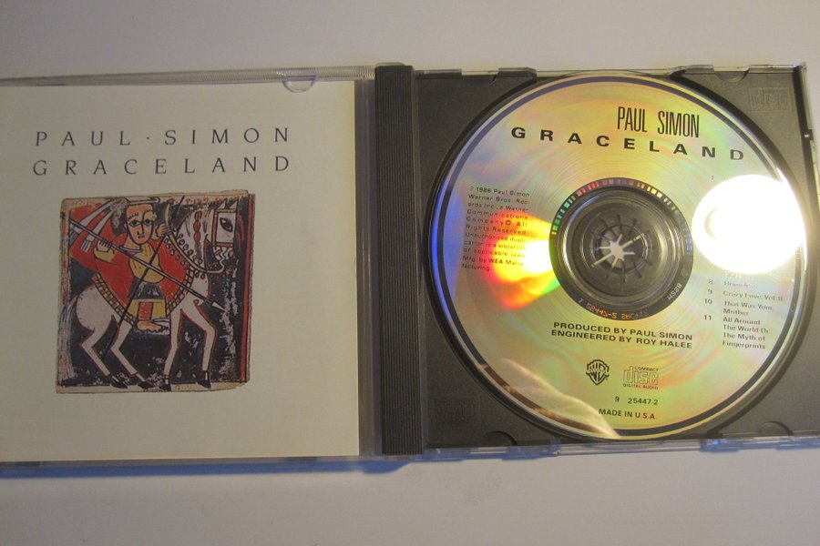 CD-album med Paul Simons "Graceland". Skivan innehåller låtarna "Homeless", "Crazy Love, Vol. II", "That Was Your Mother", "All Around The World Or The Myth of Fingerprints". Producerad av Paul Simon och konstruerad av Roy Halee. Tillverkad i USA.