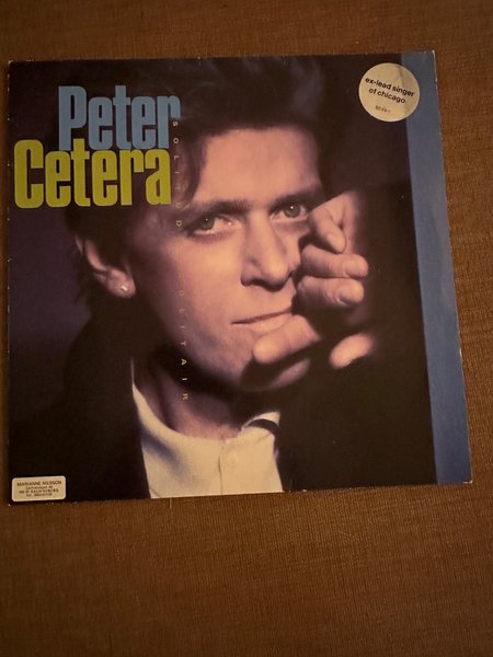 Vinylskiva med Peter Cetera, "Solitaire". Skivan är märkt med "ex-lead singer of Chicago" och har nummer 925474-1.