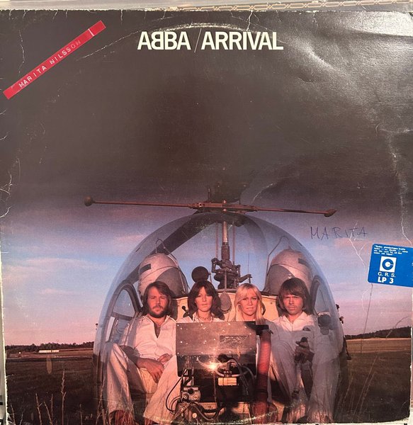 ABBA - Arrival LP. Skivan är märkt med "MARITA NILSSON" och "MARITA". Skivan har även en klisterlapp med texten "Sedan plomberingen brutits bytes-ev. Stertas varen om det varit fel på den redan vid köpet" och "G. R. S. LP 3".