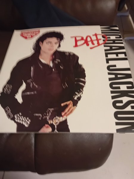 Michael Jackson - Bad vinylskiva. Framsidan visar Michael Jackson i svart jacka med texten "BAD" i rött och "MICHAEL JACKSON" längs högerkanten