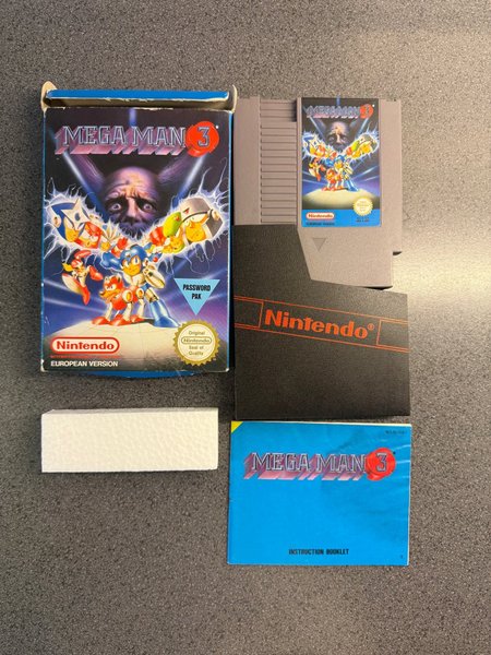 Komplett Mega Man 3 till Nintendo NES. Inkluderar box, kassett, manual, frigolit och pappersinsats.