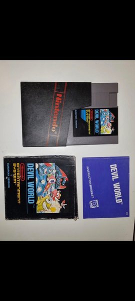 Devil World till Nintendo NES i europeisk version. Spelet inkluderar kassett, box och instruktionsbok.