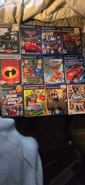 Här är ett gäng Playstation 2 spel. Titlarna inkluderar Medal of Honor Vanguard, Bilar, The Sims Bustin' Out, Commandos Strike Force, The Incredibles, Monster Rumble, Tarzan Freeride, Need for Speed Underground, Grand Theft Auto Vice City, Eye Toy Play Sports, Sagan om Konungens Återkomst, och The Sims 3 Destination Världen.