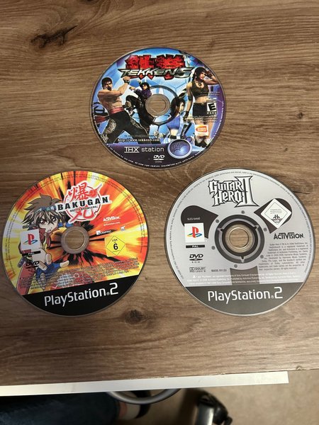 Tekken 5, Bakugan battle brawlers och guitar hero 2 till ps2. Tyvärr har jag ingen ps2 att testa spelen på längre. Och det finns inga fodral till dom så det är endast skivorna som säljs. Det står inte playstation på Tekken 5 skivan men antar att det är till ps2?