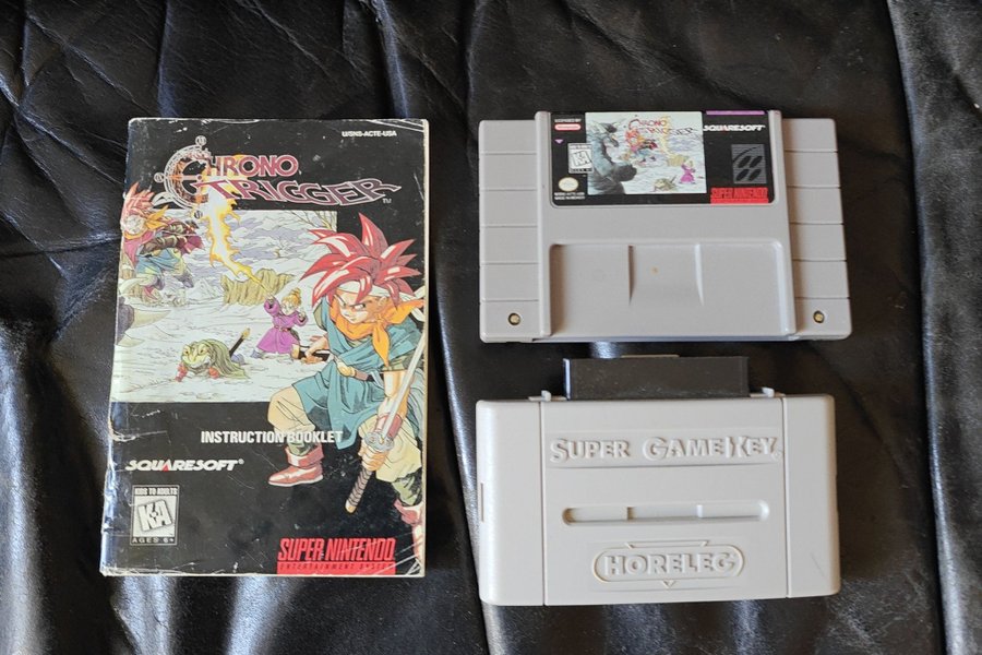 Chrono Trigger till Super Nintendo (SNES) NTSC. Spelet är utvecklat av Squaresoft. Medföljer gör spelet och en Super Gamekey-adapter för att spela på Pal snes enheter. Manual följer också med. Har lött in en batterihållare så när batteriet behöver bytas skruvar man bara upp kassetten och klickar i nytt cr2032 batteri