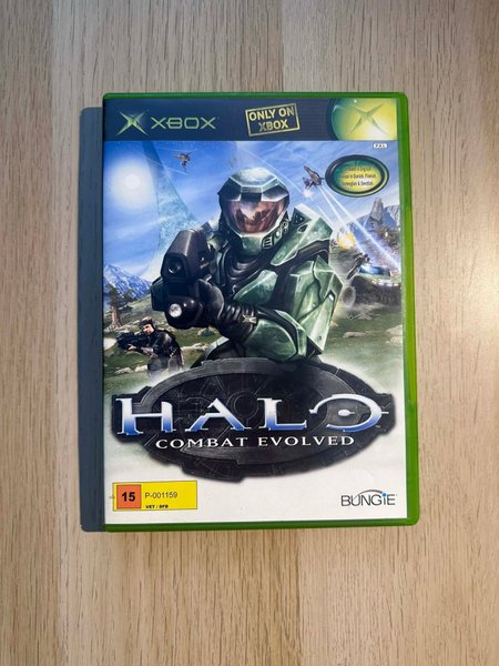 Halo Combat Evolved till Xbox. Spelet är på engelska. Manualen är på danska, finska, norska och svenska. Spelet är utvecklat av Bungie.