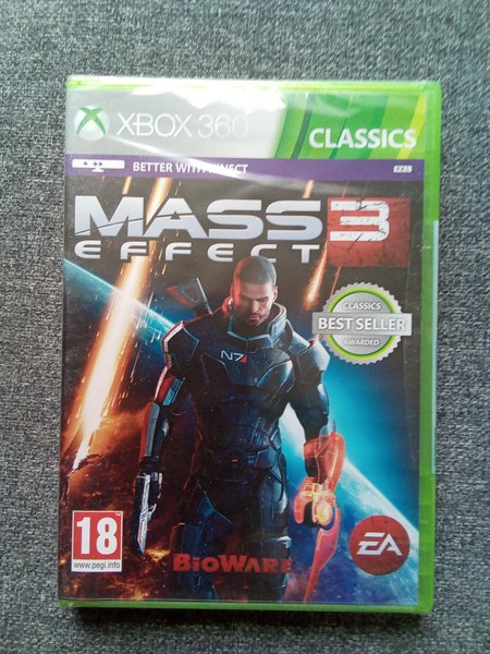 Mass Effect 3 för Xbox 360. Spelet är en del av Classics-serien och har utmärkts som "Best Seller Awarded". Utvecklat av BioWare och publicerat av EA. Spelet har en åldersgräns på 18 år enligt PEGI.