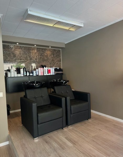 Schamponeringsstol i svart konstläder med tillhörande handfat. Stolen har en modern design med raka linjer och en bekväm sits. Handfatet är integrerat och har en stilren svart finish. Perfekt för en frisörsalong eller hemmabruk.