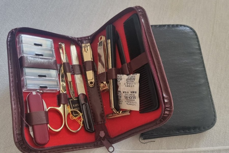 Ett praktiskt manikyrset. Innehåller diverse verktyg för manikyr och pedikyr, inklusive sax, nagelklippare, pincett, rakhyvel och kam.