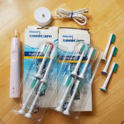 Philips Sonicare eltandborste med tillbehör. Inkluderar laddare, resefodral och borsthuvuden.